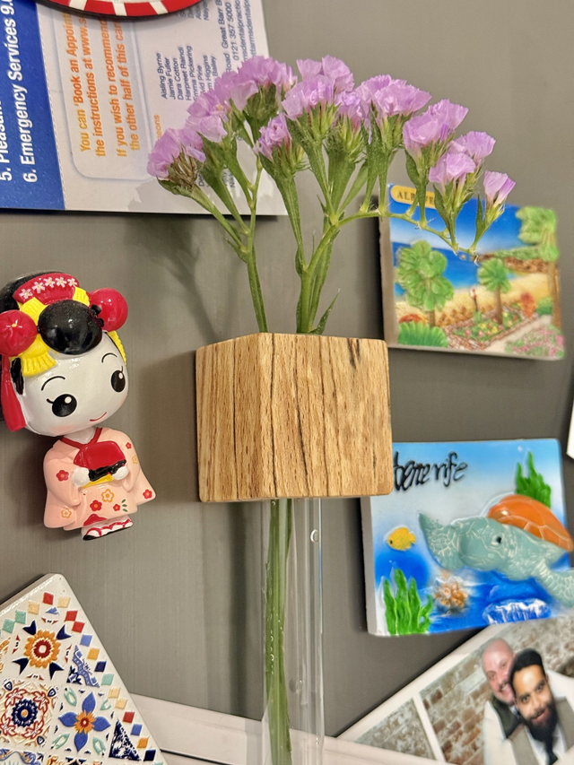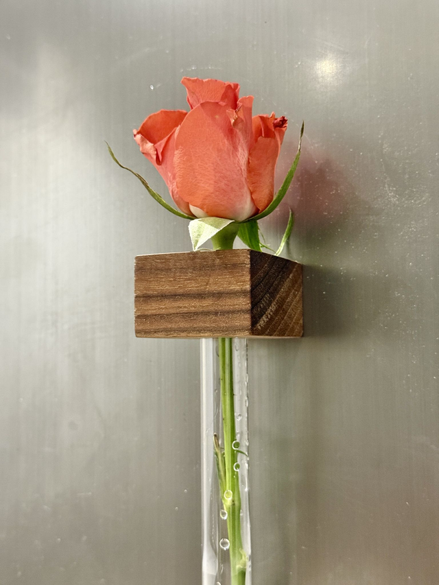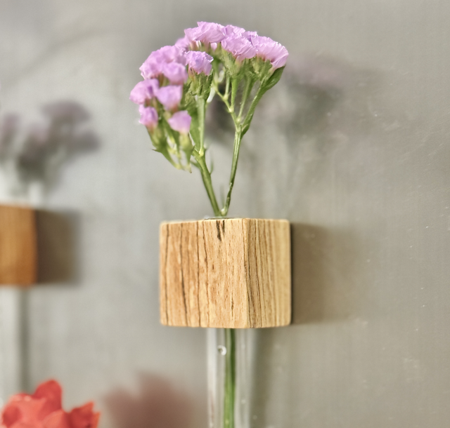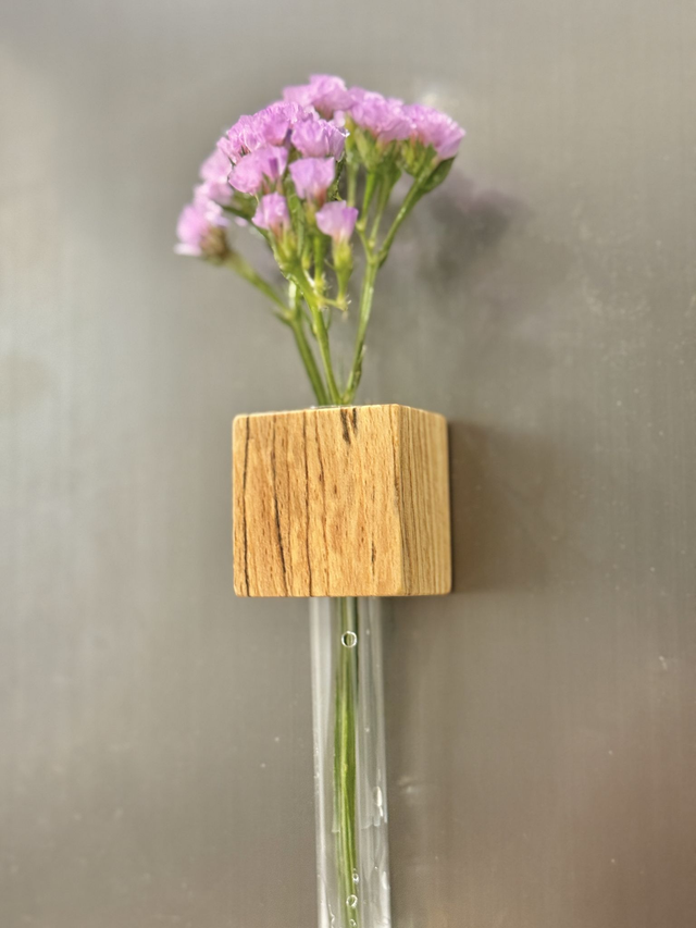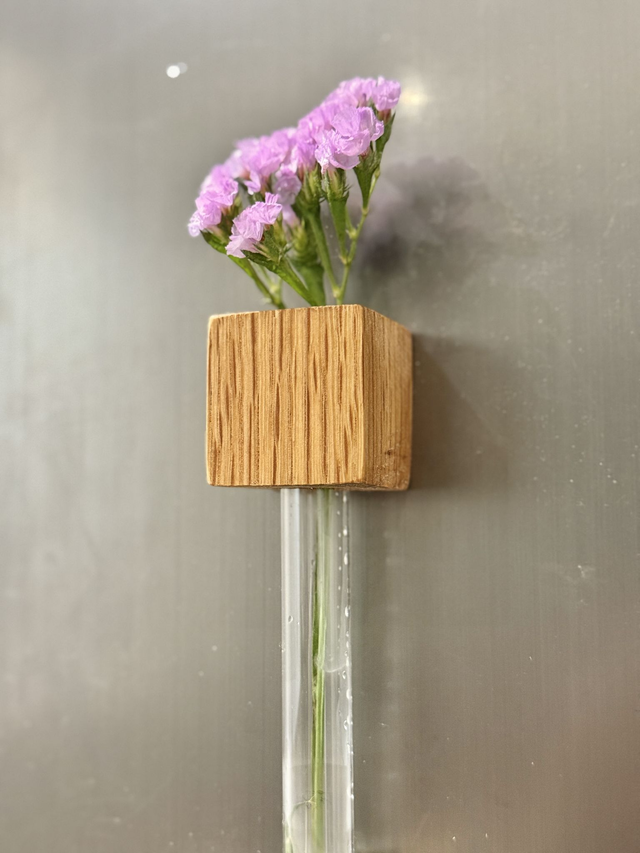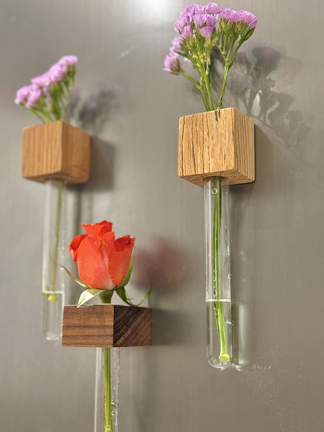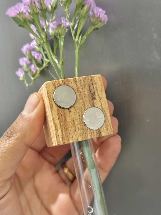 Each vase comes with a 16mm test tube that can be taken out and filled with water, we recommend only filling around 1-2 fingers worth of water. The wooden block has 2 strong magnets on the back.