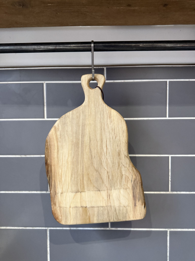 This chopping/serving board is made from SYCAMORE wood. The rough dimensions are (Length) 34cm (Width) 22cm (Thickness) 1.3cm .